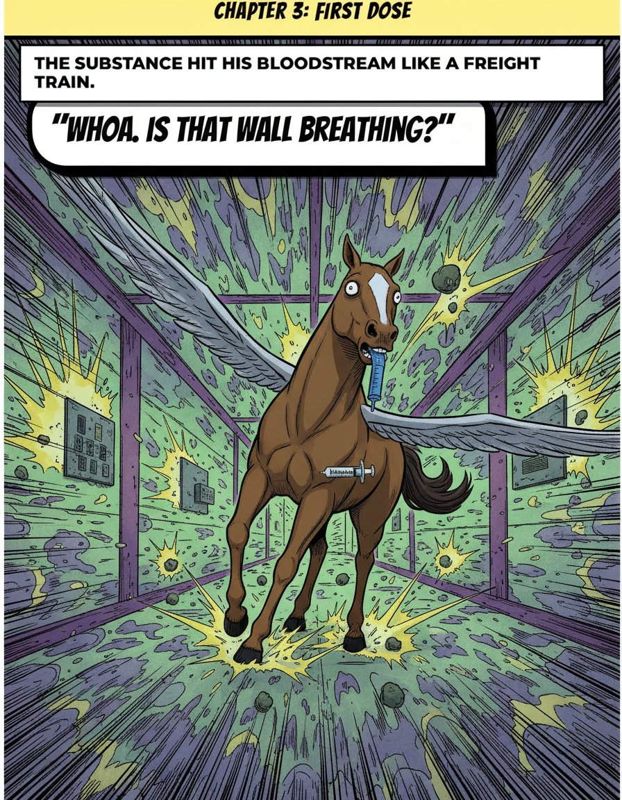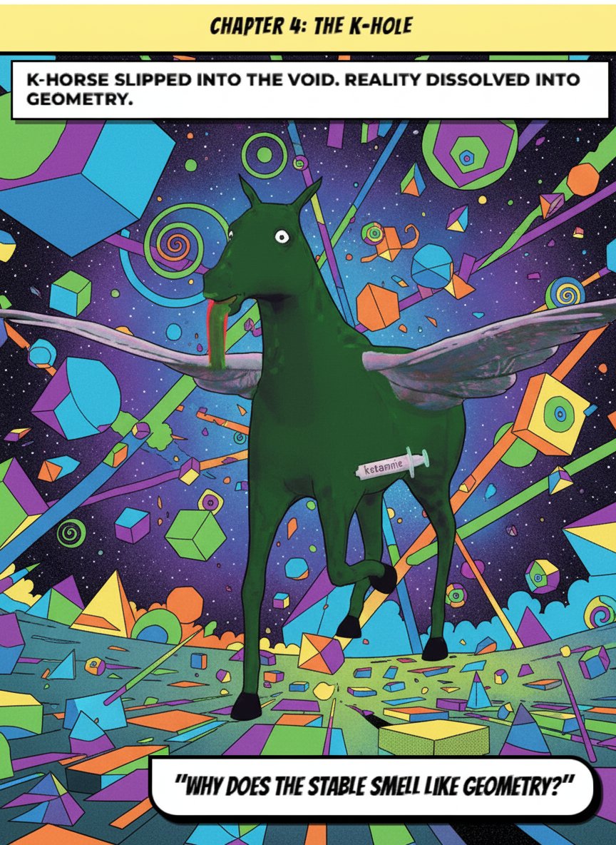 Once upon a time, in a dimension where logic doesn't exist and physics took a sick day, a horse discovered ketamine. Not just any horse - K-HORSE.
